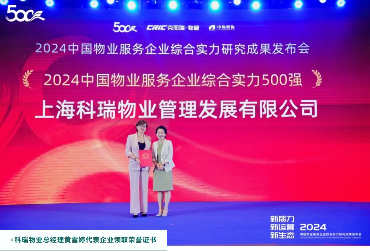 8月22日,2024中国物业服务企业综合实力研究成果发布会在上海举办。来自全国各地的30余家省市级物业协会会长、秘书长,50余位大咖嘉宾,近600位物业上下游产业链的行业同仁齐聚。会议发布了“2024中国物业服务企业综合实力500强”“2024中国物业服务企业综合实力细分领域”“2024中国物业管理卓越标杆项目”等一系列研究成果,以物业综合实力领域权威成果为行业树立了年度风向标。 在「2024中国物业服务企业综合实力研究成果」中,科瑞物业凭借稳健的财务表现、卓越的运营能力和良好的服务口碑,荣获“2024中国物业服务企业综合实力50强第42名”,较去年提升4位。 荣获“2024中国产业园区物业服务领先企业”“2024中国行政办公物业服务领先企业”以及“2024中国红色物业服务领先企业”。 荣获“2024中国物业管理卓越标杆项目——上海市五爱高级中学(学校)”“2024中国物业管理卓越标杆项目——上海绿地中环广场(产业园区)”共计六项荣誉。